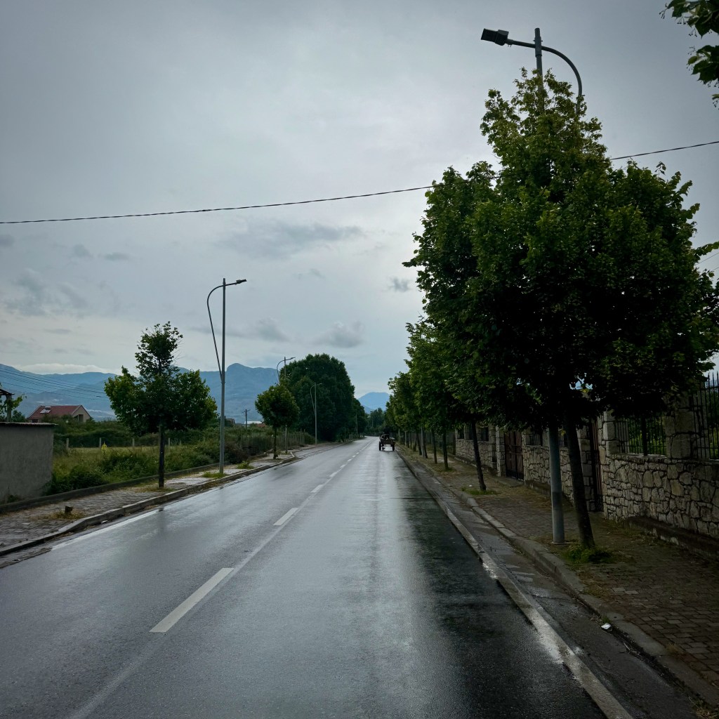 It’s neutralized in the city, but we aren’t to ride with each other. We’re one ragged group. Traffic laws in Shkodër, particularly for cyclists, seem already to be observed on something like a voluntary basis, and we’re not questioning the right of way the group seems to get. Some curious onlookers. But it is raining, so not a lot of ceremony once we’re a block out.