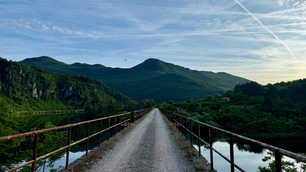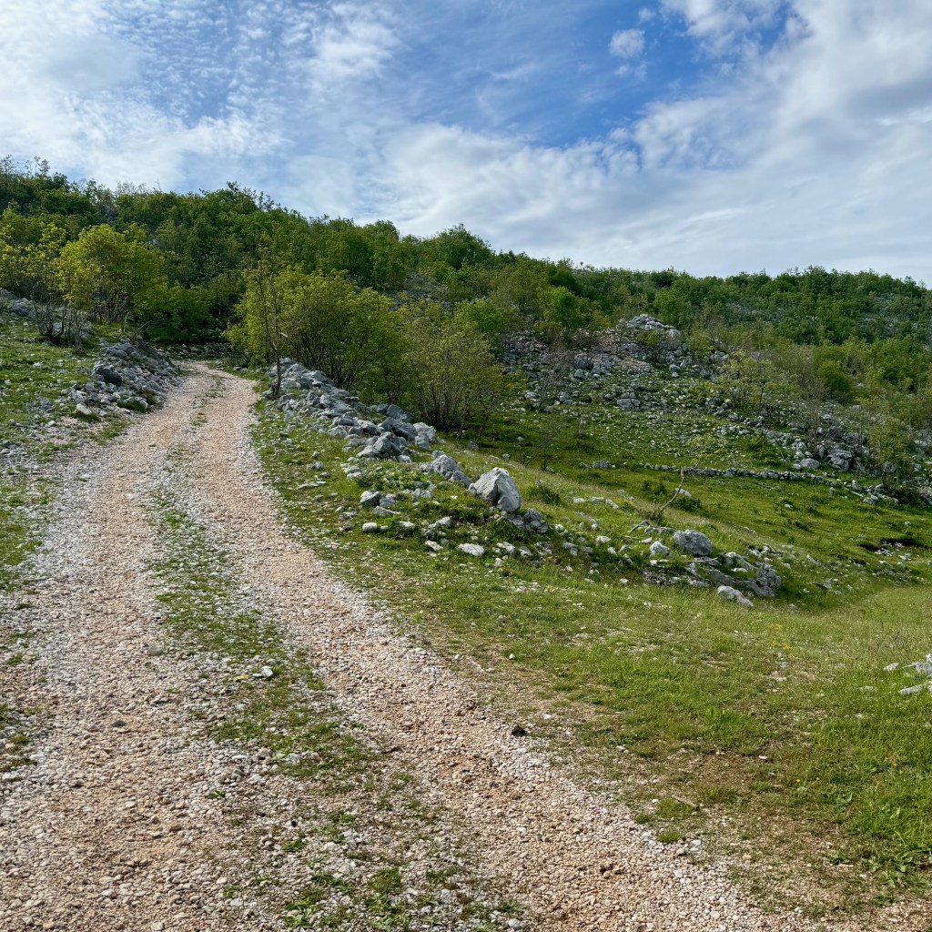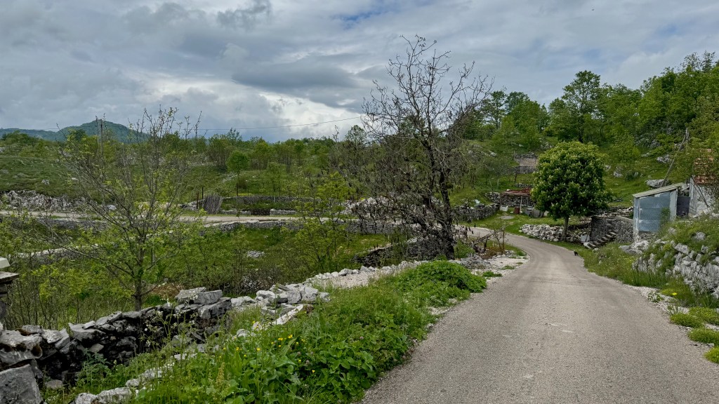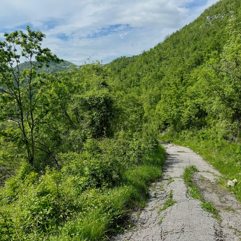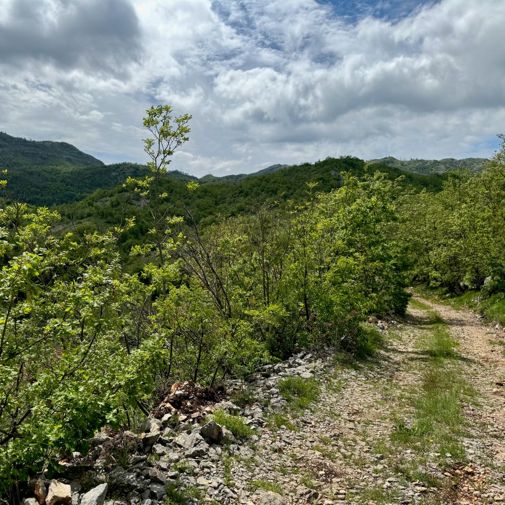Podgorica is in a valley. We are to cross it and then get up on a rolling plateau. Then we’ll drop down into Bosnia and Herzegovina, where we will follow a defunct railway, now a bike path-cum-tourist development idea. At around Buna, where I plan to finish the day (but–spoiler–won’t), the route climbs up into the mountains again.