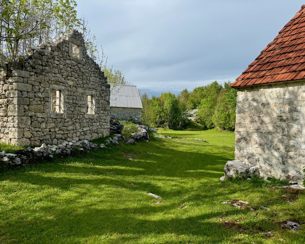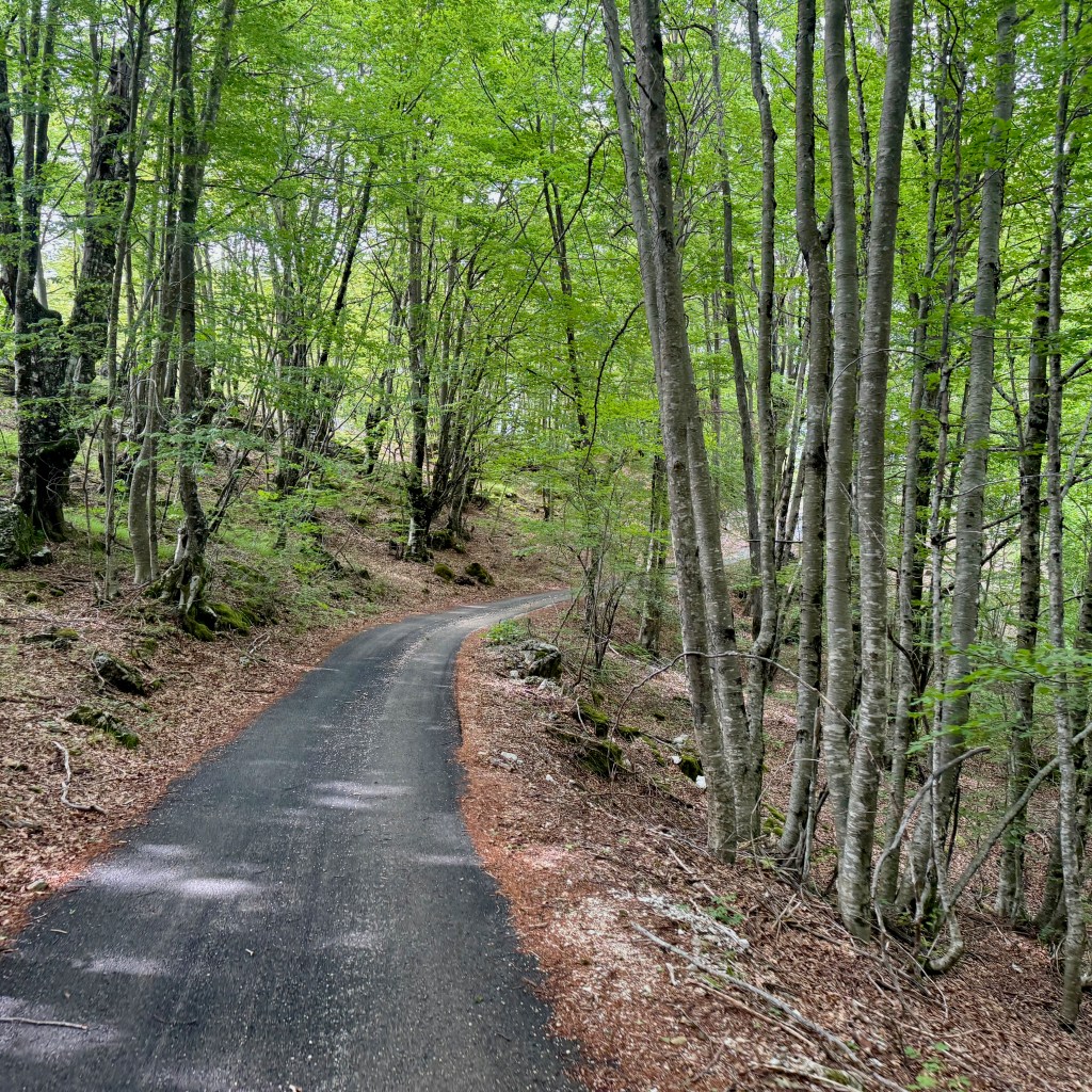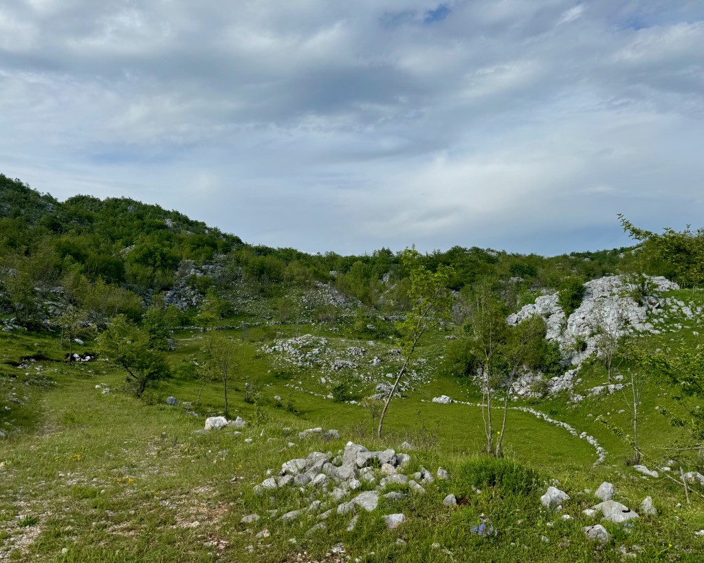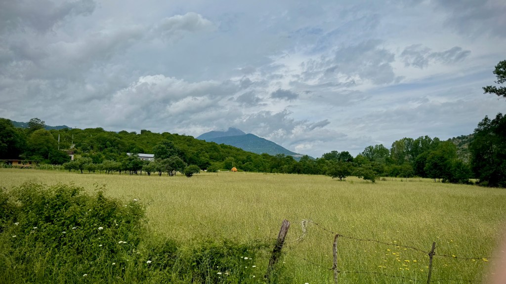 On the plateau it’s not fast. The path rolls up and down, sometimes smooth, sometimes chunky gravel, sometimes champagne. A little bit of a lot. A lot is paved. For the most part it doesn’t seem to bop from village to village, but instead from pasture to pasture. The topography is complicated, and we twist through hollows and nooks in between wide open sections of scrubby, rocky shrub- and grassland.