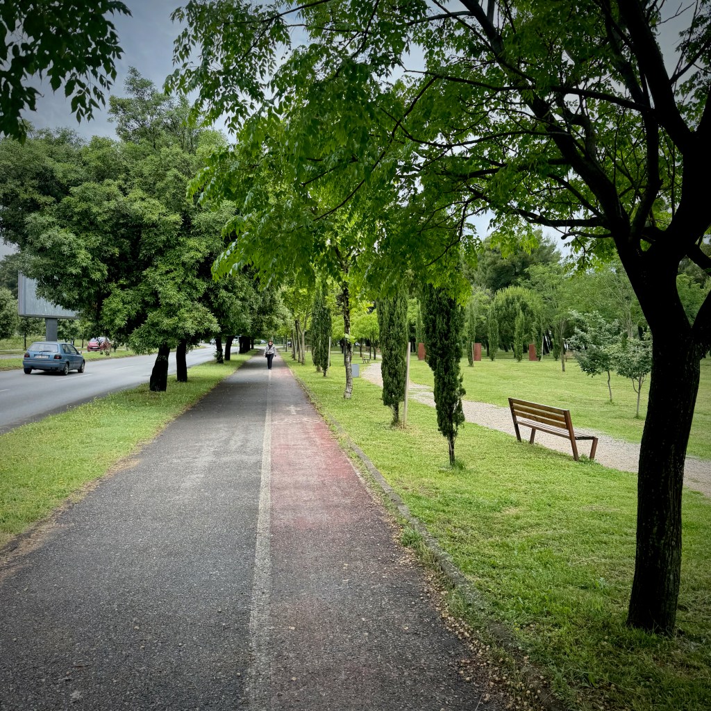 The ride through town is down a handsome tree-lined boulevard with lots of cafes and restaurants. Seems lively, but nowhere looks like a good bet for a takeaway pizza, aka all I want. I leave disappointed. And it’s basically dark now.