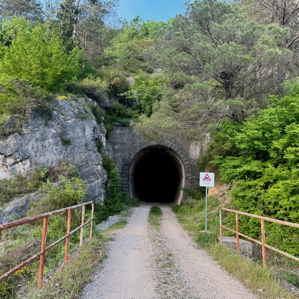 We take some turns onto paths running along the edges of fields, the beginnings of the Ciro trail, one of the marquee sectors of the race. This is the defunct railbed I mentioned earlier, built in the latter days of the Austro-Hungarian empire–think 1880s.